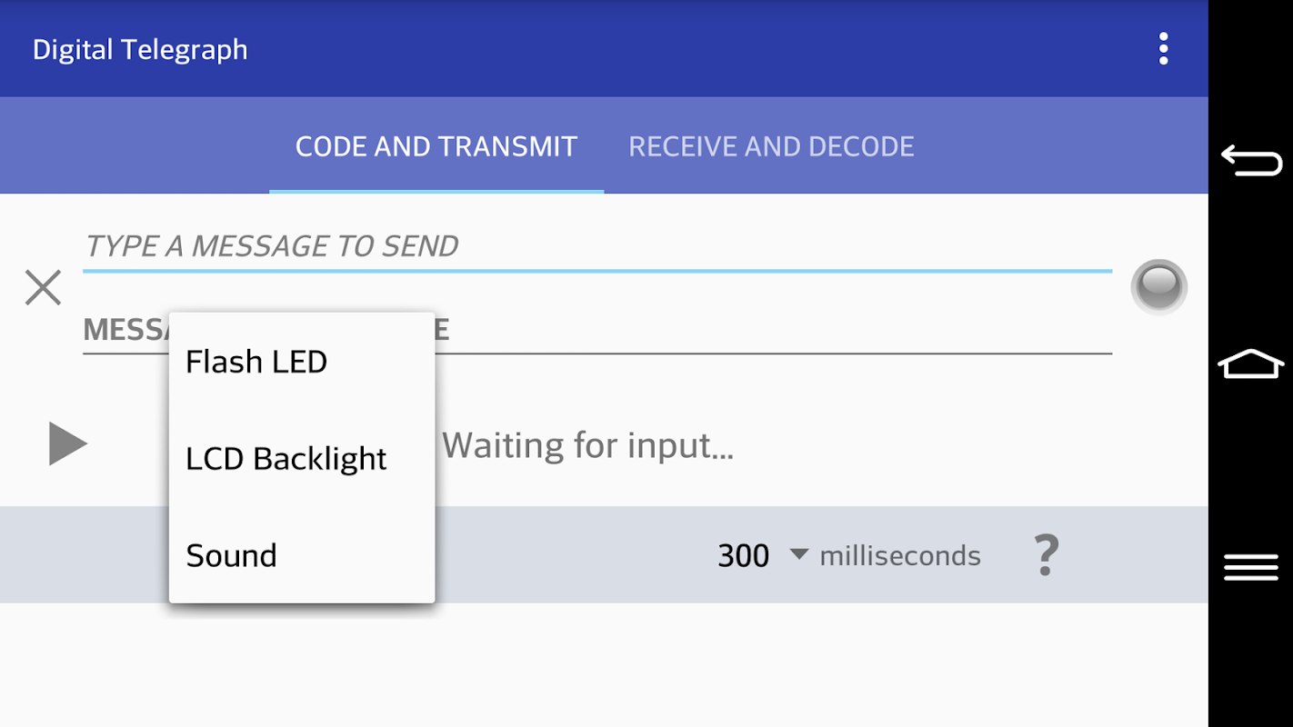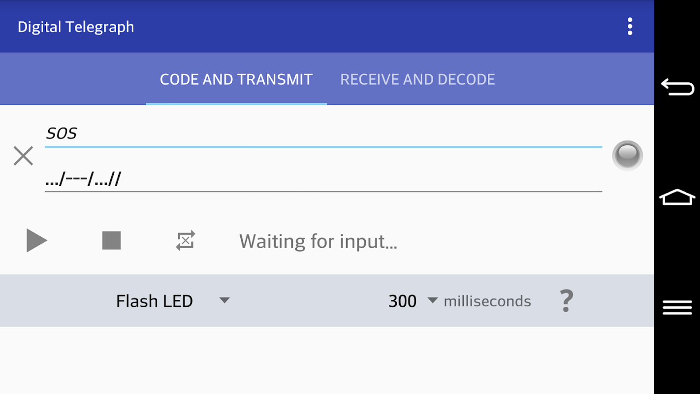 - CODE and SEND: choose light or sound, write a message and let the cellphone code it into morse and send it.