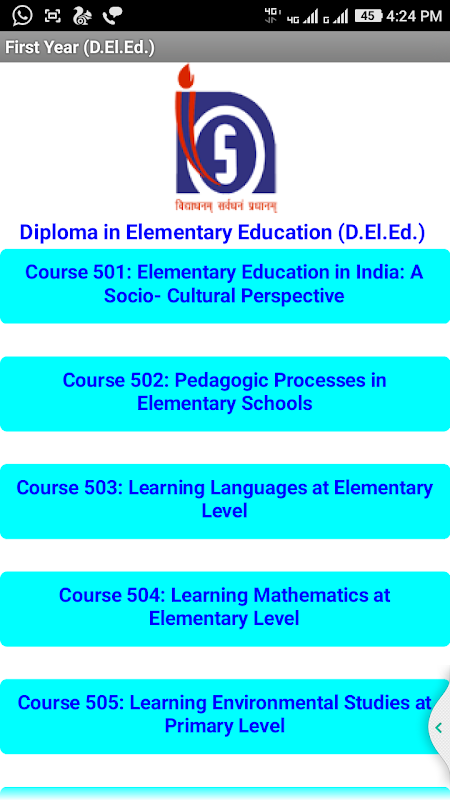 Diploma in het basisonderwijs programma (D.El.Ed) is een speciaal pakket voor de na- en ongetrainde leerkrachten werken in de basis / bovenbouw van het basisonderwijs scholen van de verschillende staten van het land. Het programma is ontwikkeld door de Academische Afdeling, NIOS op initiatief van het ministerie van Human Resource Development (MHRD), Govt. of India, rekening houdend met de NCF 2005 RTE 2009 en NCFTE 2010. Het programma is gericht op het mogelijk maken de doelgroep te ontwikkelen in hun vaardigheden, competenties, attitudes en het begrip van het onderwijs te maken en te leren effectiever