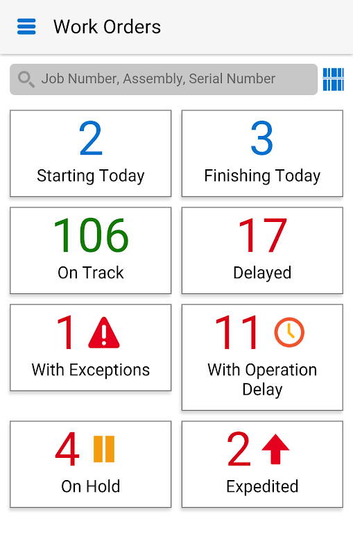 - Filter en zoek, of scan werkorders met streepjescodes om de voortgang te bekijken (op schema, vertraagd, in de wacht, uitzonderingen)