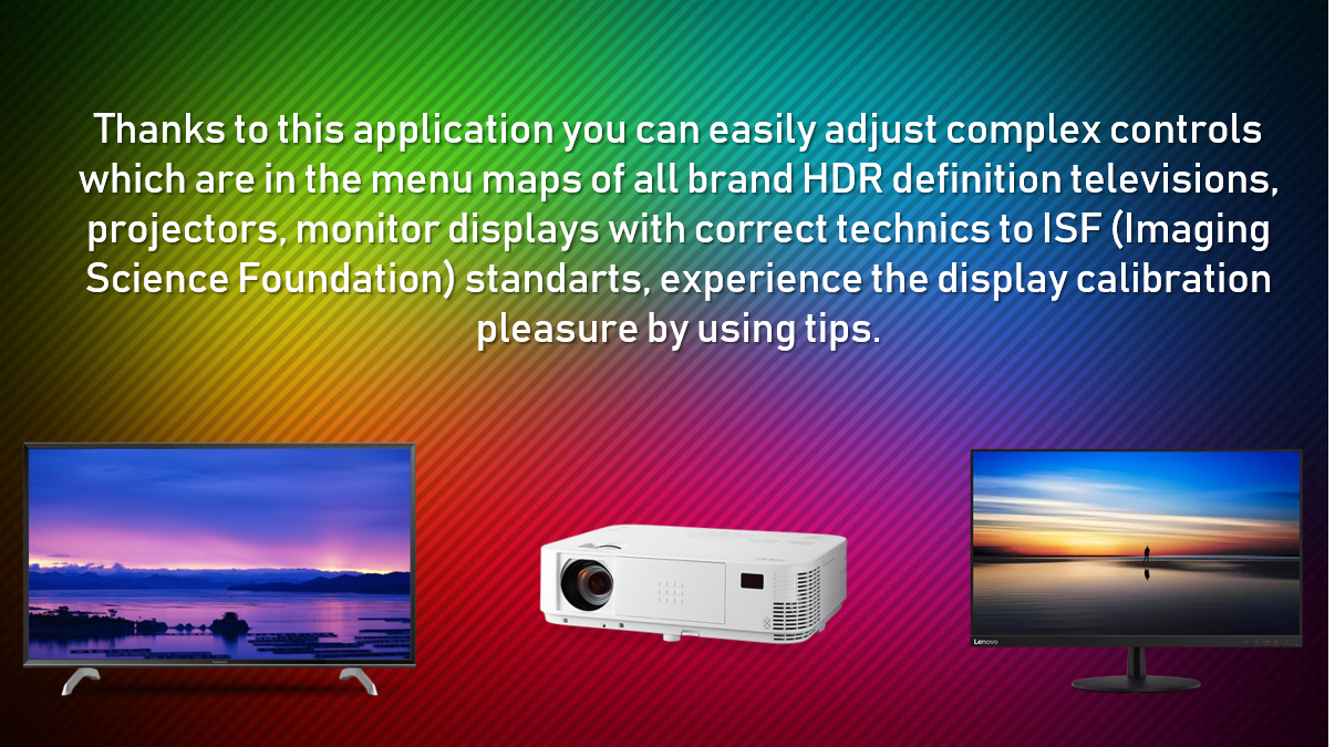Dankzij deze applicatie kun je eenvoudig complexe bedieningselementen aanpassen die in de menukaarten van alle merken HDR-definitietelevisies, projectoren, monitorschermen met de juiste techniek tot ISF (Imaging Science Foundation) standaarden staan, ervaar het plezier van weergavekalibratie door gebruik te maken van tips.