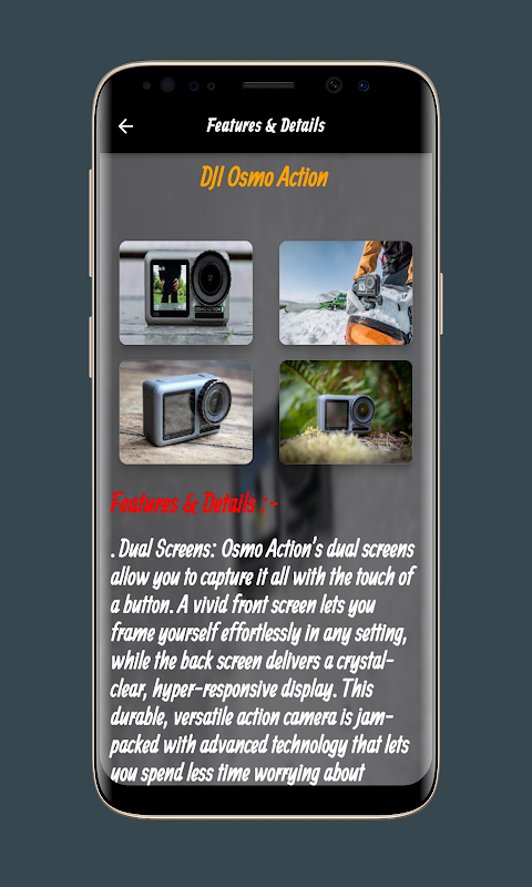 De applicatie DJI Osmo Action Guide bevat veel informatie en functies van de DJI Osmo Action die je duidelijk en gemakkelijk kunt krijgen. Via de DJI Osmo Action Guide-applicatie kun je een video bekijken van de DJI Osmo Action, waarmee je het uiterlijk en de kenmerken van de DJI Osmo Action Guide kunt zien. Het heeft ook veel verschillende functies, waaronder Dual Screens: Dual screens in Met Osmo Action leg je alles met één druk op de knop vast. Met het heldere scherm aan de voorkant kun je jezelf moeiteloos overal inlijsten, terwijl het scherm aan de achterkant een ultrahelder, ultra-responsief scherm biedt