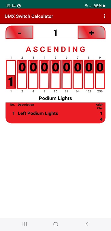 Eenvoudige app om het adres en de kanalen van uw DMX-apparaten weer te geven. Het enige wat u hoeft te doen is het startadres van uw eerste DMX-apparaat in te voeren en het aantal kanalen in te voeren van elk DMX-apparaat dat u wilt aansluiten.