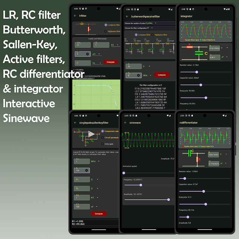 Ontdek de wereld van elektronica met onze uitgebreide app! Krijg toegang tot gedetailleerde beschrijvingen van populaire elektronische componenten, waaronder transistors, diodes, condensatoren, flip-flops, IC's en meer. Onze app bevat ook een uitgebreide verzameling elektronische circuitdocumenten voor een beter begrip. Los eenvoudig circuitberekeningen op met behulp van onze geavanceerde rekenmachine, inclusief weerstandscalculator, inductorontwerpcalculator, filterontwerpcalculator, 555 timercalculator en meer. Visualiseer uw versterkerontwerpen met de rustpuntplotfunctie en ontwerp eenvoudig Butterworth-filters. Of je nu student, hobbyist of professional bent, onze app is de perfecte tool voor al je elektronicabehoeften.