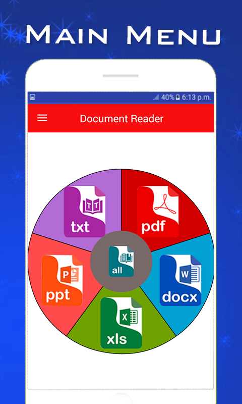u kunt allerlei soorten documenten en bijna alle tekstbestanden openen, inclusief powerpoint- en pptx-bestanden om uw Power Point-gebaseerde presentaties te bekijken. bereid uw documenten voor met de beste documentenlezer- pdf-lezer & office docs reader.document reader-allerlei soorten lezers. nu kun je eenvoudig je Excel-spreadsheets op je Android-telefoon plaatsen. Met deze applicatie kun je offline pdf-documenten en andere bestanden zoals Word Docx-bestanden bekijken. deze applicatie kan u de gemakkelijkste faciliteit voor het lezen van documenten bieden. het is een toepassing voor het lezen van documenten voor uw telefoon. u kunt het gebruiken als uw lezers voor kantoordocumenten en studenten kunnen deze toepassing ook installeren om hun Power Point-dia's op hun telefoon te gebruiken en te bekijken. word office documents reader & viewer. nu kunt u al uw bestanden verkennen, of ze nu txt-bestanden zijn of andere xls-bestanden / csv-bestanden / ppt-bestanden / excel-bestanden. Ze kunnen allemaal gemakkelijk door u worden gelezen op uw mobiele telefoon. alle documenten viewer applicatie is een zeer expert bestanden reader-applicatie voor je Android-telefoon.