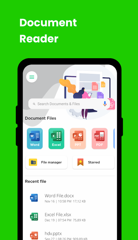 Document Reader, Office Reader, PDF Reader is een snelle manier om Word-documenten op uw apparaat te lezen. Het heeft ondersteuning voor Word-bestanden. Je kunt al je bestanden op één plek doornemen