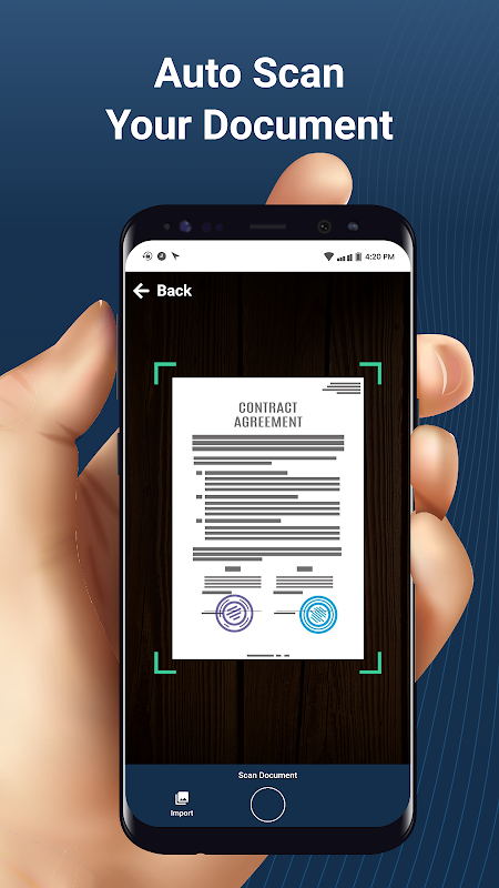 "Documentscanner: PDF & afbeelding" detecteert automatisch de rand van het papier dat u wilt scannen voor hoge kwaliteit. De documentscanner-app snijdt het specifieke gebied van het document dat u wilt scannen weg. Gebruikers kunnen de camera van de mobiele telefoon gebruiken om alle soorten documenten, notities, ontvangstbewijzen, facturen, visitekaartjes, whiteboard-discussies en certificaat te scannen en te controleren. Organiseer en geef uw gescande documenten een naam of u kunt deze ook delen met behulp van een pdf-scanner-app. U kunt scannen en PNG- en JPEG-bestanden van hoge kwaliteit krijgen. Deze pdf-converter verwijdert automatisch vervormde achtergronden voor betere resultaten.