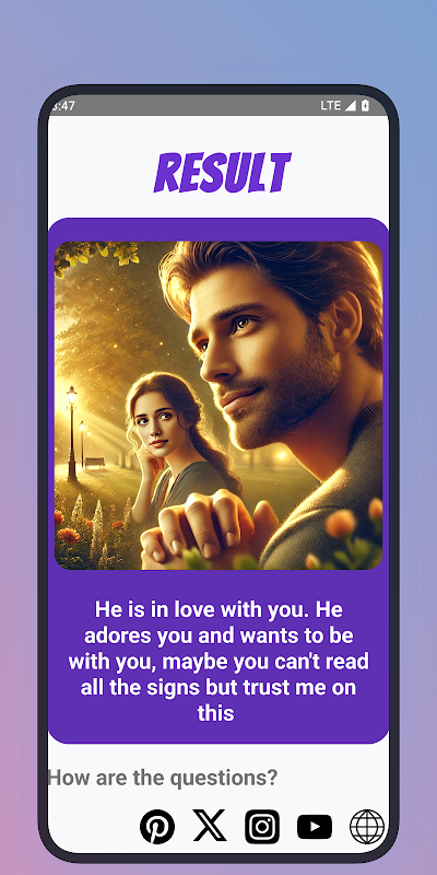 Heb je jezelf ooit afgevraagd: 'Vindt hij mij leuk?' Ontdek het antwoord met onze Does He Like Me Quiz-app! Deze leuke en gebruiksvriendelijke app is ontworpen om je te helpen de signalen en gevoelens van je geliefde te ontcijferen en biedt alle inzichten die je nodig hebt.