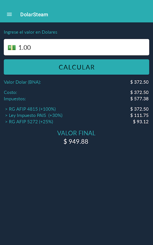 DólarSteam Argenta Calculator is het essentiële hulpmiddel voor gebruikers van het Steam-platform in Argentinië die directe en nauwkeurige conversies willen maken tussen dollars en Argentijnse peso's. Deze intuïtieve en eenvoudig te gebruiken applicatie is speciaal ontworpen voor de gaminggemeenschap en biedt een snelle en betrouwbare oplossing om de huidige waarde van de dollar in realtime te berekenen.