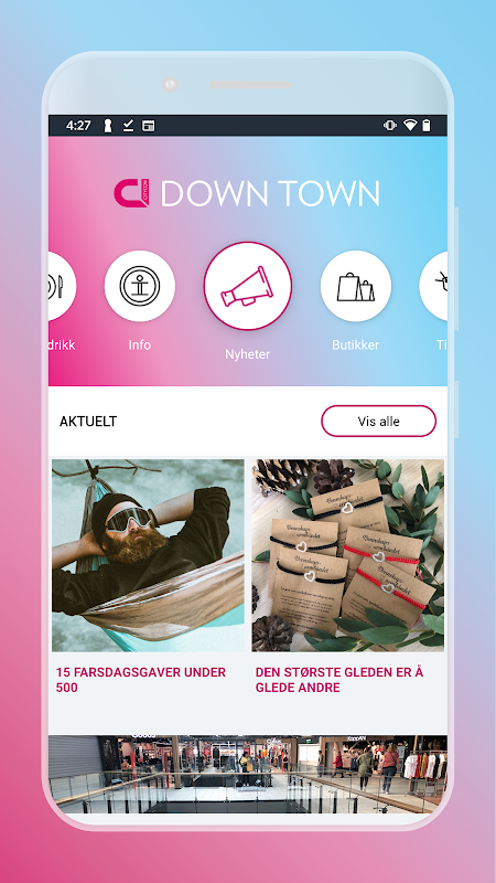 Mobilappen til Down Town kobler dine personlige fordeler med den siste informasjonen om butikkene, nyhetene og arrangementene i kjøpesenteret.