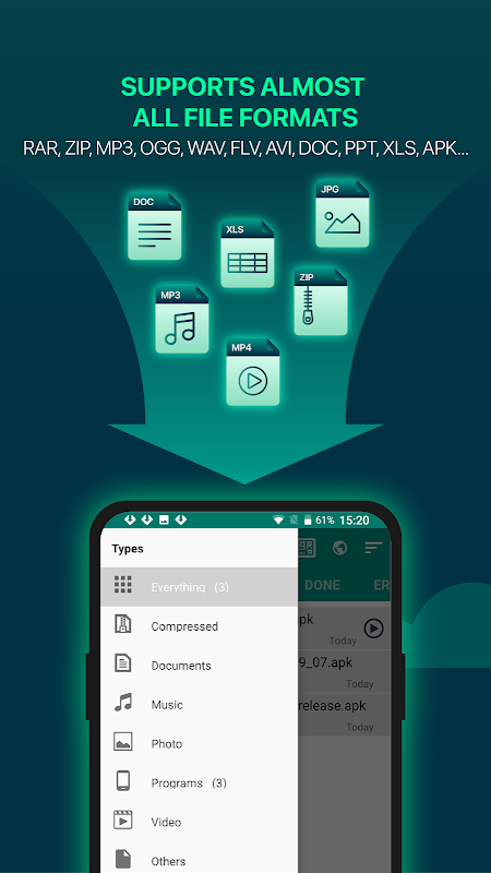 - Download manager sorteer bestanden op naam, grootte, type, volgorde en categoriseer op type.