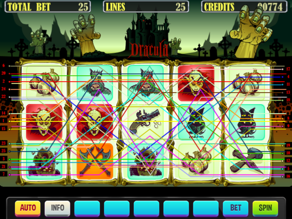 This Dracula slot machine will give you the power to suck out as many winnings as you please. Dracula is a 25 lines payout, 5 reels, with 2 bonus games, the possibility of doubling or quadrupling. You can bet from 1 to 25 coins for 1 played line and you can play from 1 to 25 lines.