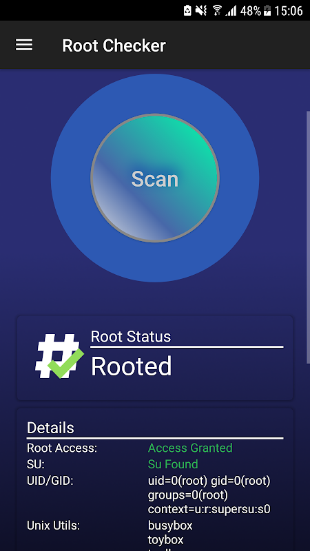 Droidbug Root Checker gives you an easy and quick way to check whether your phone is 'Rooted'. Optionally it also gives you a detailed information about su and busybox executables.