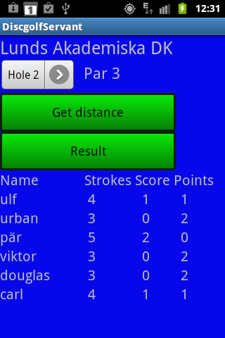 The first thing you have to do after installing DS-Lite is to enter the course you want to play. If you can not find someone that already have done this job, from which you can get a file to import, then you need to do this yourself. Entering the "hard facts" about the course (name/num of holes, hole data) is easy, to enter location reference data (for the GPS rangefinder) you can use Google maps to find the latitude/longitude values needed. This is a process that takes an hour or two. To get the feel for the application before investing this amount of time, you can download the template course file from the developer web site. As that is a complete and working course definition you can then import it, and run a simulated round on it. Select it for playing, enter one or more players as new players, and try it out. If you are sitting close to a window you can even start the GPS, and try the range finder (the distances measured will be to the greens of this Swedish course). You can add new references, and maybe move around a little to measure the distance to these. If you like the app after this exercise, you can then invest in entering the data for your course, and the go for a real round of disc golf.