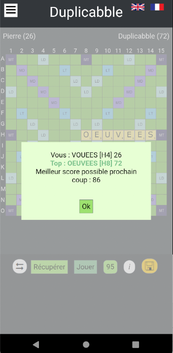Wanneer je tegen de computer speelt, wordt het beste woord geplaatst, maar je moet weten dat de computer altijd het best mogelijke woord vindt, dit is een spelmodus die sommige spelers ons hebben gevraagd om te trainen.