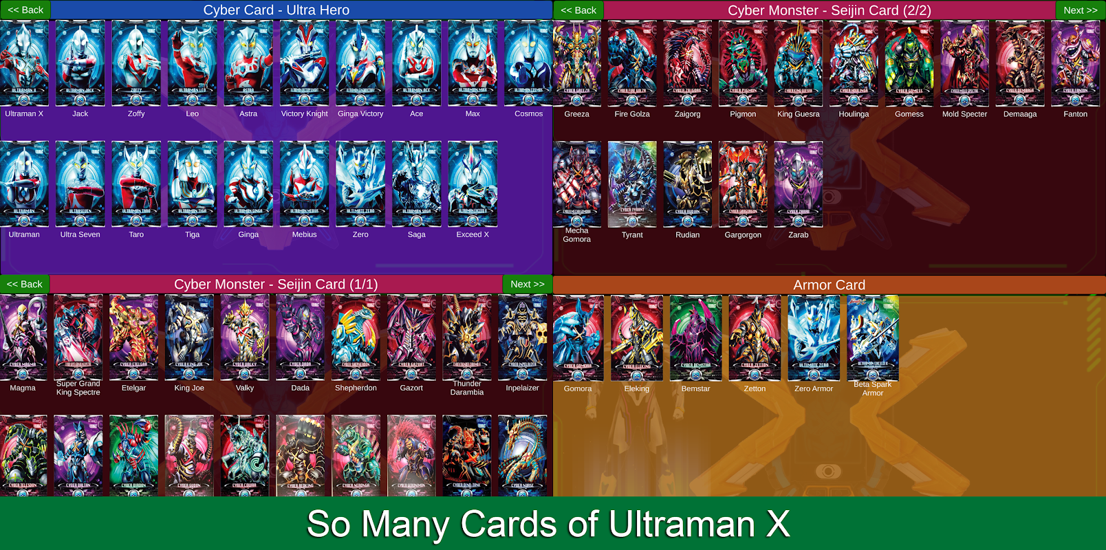 This Ultra-Man X Ring DX android Simulation game includes all Cards. Starting from the Showa Era to Heisei. There are many single cards and combination cards for 2 cards to become Fussion Up. There is also a Trinity Fussion feature for 3 cards and Ultra-Man Org Origin.