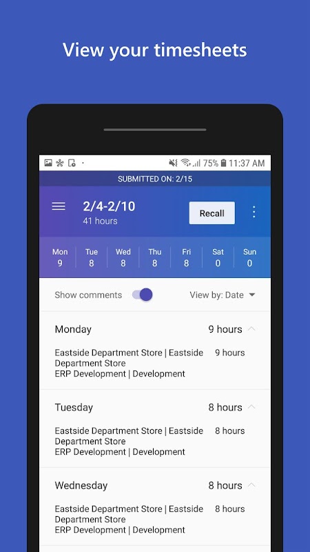 Met de mobiele app Microsoft Dynamics 365 Project Timesheet kunnen gebruikers urenstaten voor projecten indienen en goedkeuren. Deze mobiele app onthult de urenstaatfunctionaliteit die zich in het projectbeheer- en boekhoudgebied van Dynamics 365 for Finance and Operations bevindt, waardoor de productiviteit en efficiëntie van gebruikers wordt verbeterd en de tijdige invoer en goedkeuring van projecturenstaten mogelijk wordt gemaakt.