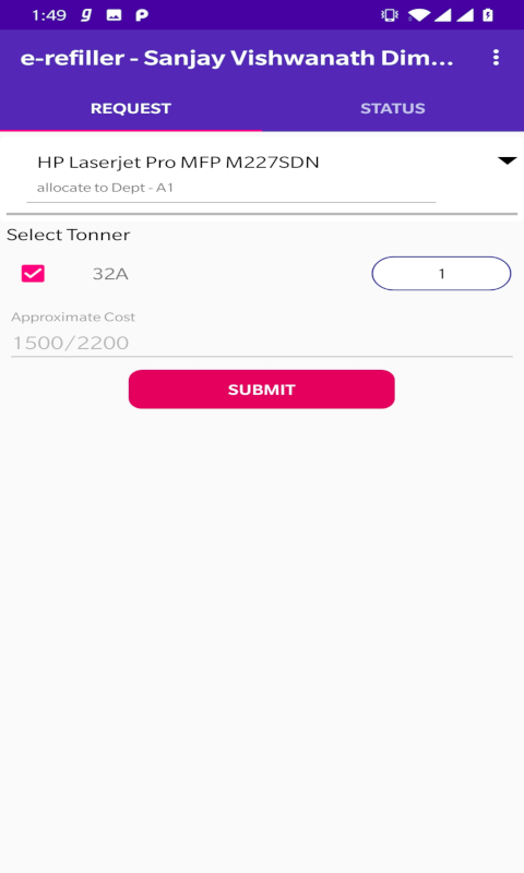 The app mainly used for sending request to administrator (Help Desk) for cartridge and tonner refilling and status of request is shown.