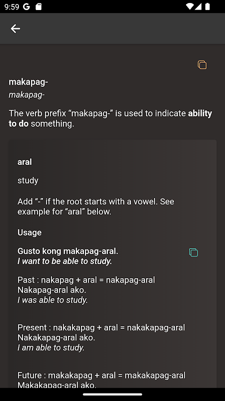 Leer hoe u eenvoudige en geavanceerde Tagalog-zinnen kunt maken door Tagalog-affixen, zelfstandige naamwoorden, werkwoorden, bijwoorden en bijvoeglijke naamwoorden en meer vertrouwd te maken. Leer Tagalog-grammatica zodat u zelf zinnen kunt maken. De structuur van deze app is om je eerst wat Tagalog-woorden te leren voordat je begroet en vervolgens in de grammatica duikt.