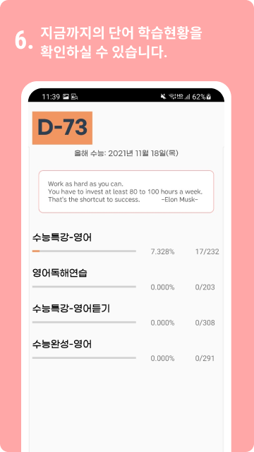 11. U kunt de leerstatus van “CSAT Special Lecture - English, English Reading Practice en CSAT Completion - English” in procenten bekijken, en er is een scherm dat u informeert over de CSAT D-Day.