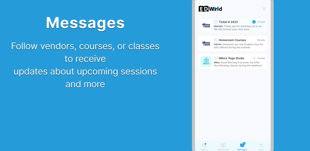 Berichten en chat: neem contact op met leveranciers voor vragen, klachten en andere problemen en volg leveranciers, cursussen of lessen om updates te ontvangen over aankomende sessies en meer.
