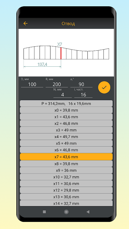 - het afsnijden van de elleboog - het vinden van de lengte van de buitenste boog en de lengte van de binnenste boog van de elleboog. Om dit te doen, moet u de diameter, straal en hoek van de elleboog invoeren.