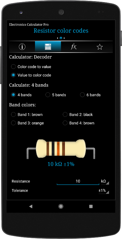 Electronics Calculator Pro is een hulpprogramma dat bestaat uit verschillende rekenmachines, conversies, referentietabellen, pin-outs en een standaard zakrekenmachine.