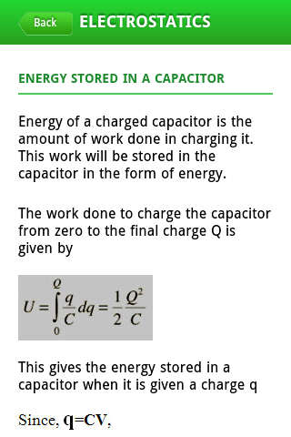 Deze titel hier in leerder serie aanvraag heeft over het algemeen twee belangrijke modules van het college natuurkunde en die zijn Elektrostatica en huidige elektriciteit. Onder Elektrostatica module probeerden we bijna alle onderwerpen van statische elektriciteit, zoals elektrische ladingen, eigenschappen van elektrische ladingen, de wet van Coulomb, elektrisch veld, elektrische veldsterkte, elektrisch veld op verschillende puntladingen, principe van superpositie, elektrische lijnen van krachten, voegen elektrische dipool, elektrisch veld door een elektrische dipool, koppel op dipool, elektrostatische potentiaal, wet gauss en haar toepassingen, geleiders en isolatoren, capaciteit, condensatoren en combinatie van condensatoren en energie opgeslagen in de condensatoren. Tweede module Actueel Elektriciteit behandelt onderwerpen zoals elektrische stroom, stroomdichtheid, driftsnelheid en haar berekeningen, wet van Ohm, elektrische weerstand en geleiding, carbon weerstanden en kleurcodering, combinatie van weerstanden, temperatuur afhankelijkheid van de weerstand, de wetten van Kirchhoff, Wheatstone brug en de bepaling van specifieke weerstand en weerstandstemperatuurcoëfficiënt. Beide modules in deze toepassing omvat bijna alles over elektrostatica en huidige elektriciteitsnetten. Studenten kunnen gemakkelijk elke elk onderwerp te leren met behulp van foto's en eenvoudige wiskundige uitdrukkingen .... Zeer nuttig tutorials voor studenten ..