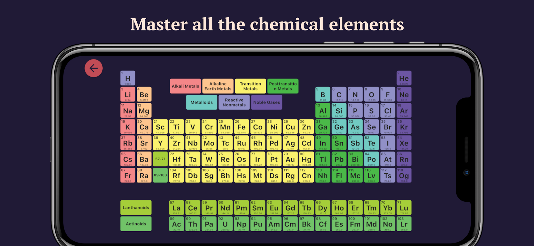 - een andere kleur voor elke module (overgangsmetalen, metalloïden, edelgassen enz.) voor een betere memorisatie.