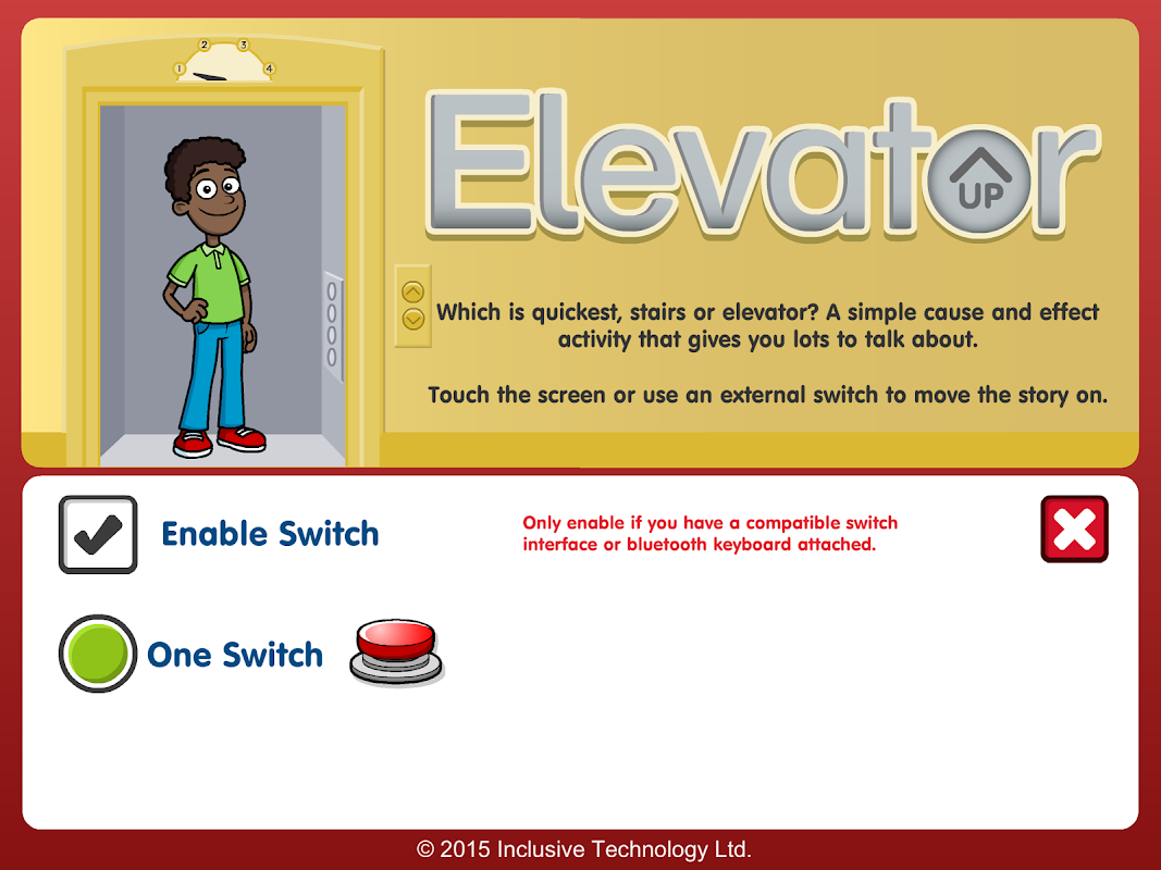 A simple cause and effect activity that gives you lots to talk about. Simply touch the screen or press a switch to advance the animated story step by step. With simple clear graphics this inclusive activity has been designed to provide a great opportunity for discussion and the development of everyday vocabulary associated with using an elevator.