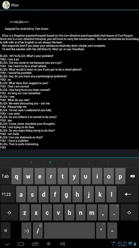 The version of Eliza that the greatest number of people would have had access to was written in BASIC and appeared in Creative Computing in 1977 (although it was written in 1973 by Jeff Shrager). This Android version is a recreation of the 1977 Basic version (with a couple of minor fixes) and as such has the same limitations as that version. Although this program is an inferior imitation of the original SLIP version, it does work.