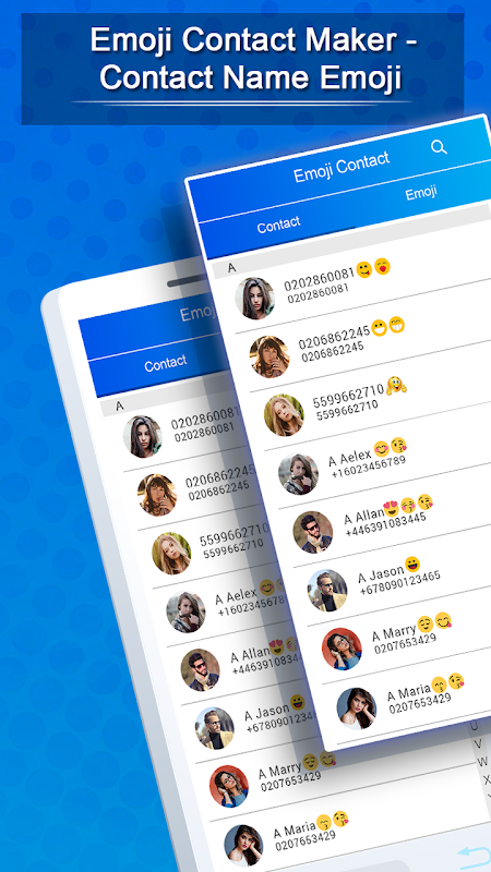 Deze applicatie heeft een eenvoudig proces om wijzigingen aan te brengen in je contacten door grappige, verdrietige, liefdevolle etc. emoji's toe te voegen aan je favoriete contact. Lunch deze applicatie gewoon op je smart-apparaat en ga aan de slag met het aanbrengen van wijzigingen in je contactenlijst en verander je volledig telefoonboek.