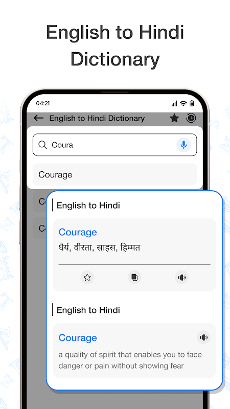 Zoek woorden direct op met het ingebouwde woordenboek Engels naar Hindi. Ontvang gedetailleerde definities, synoniemen, gebruiksvoorbeelden en uitspraakgidsen om de woordenschat te verbeteren. Bewaar belangrijke woorden en bekijk eerdere zoekopdrachten opnieuw, vind snel woorden en deel vertalingen met vrienden.