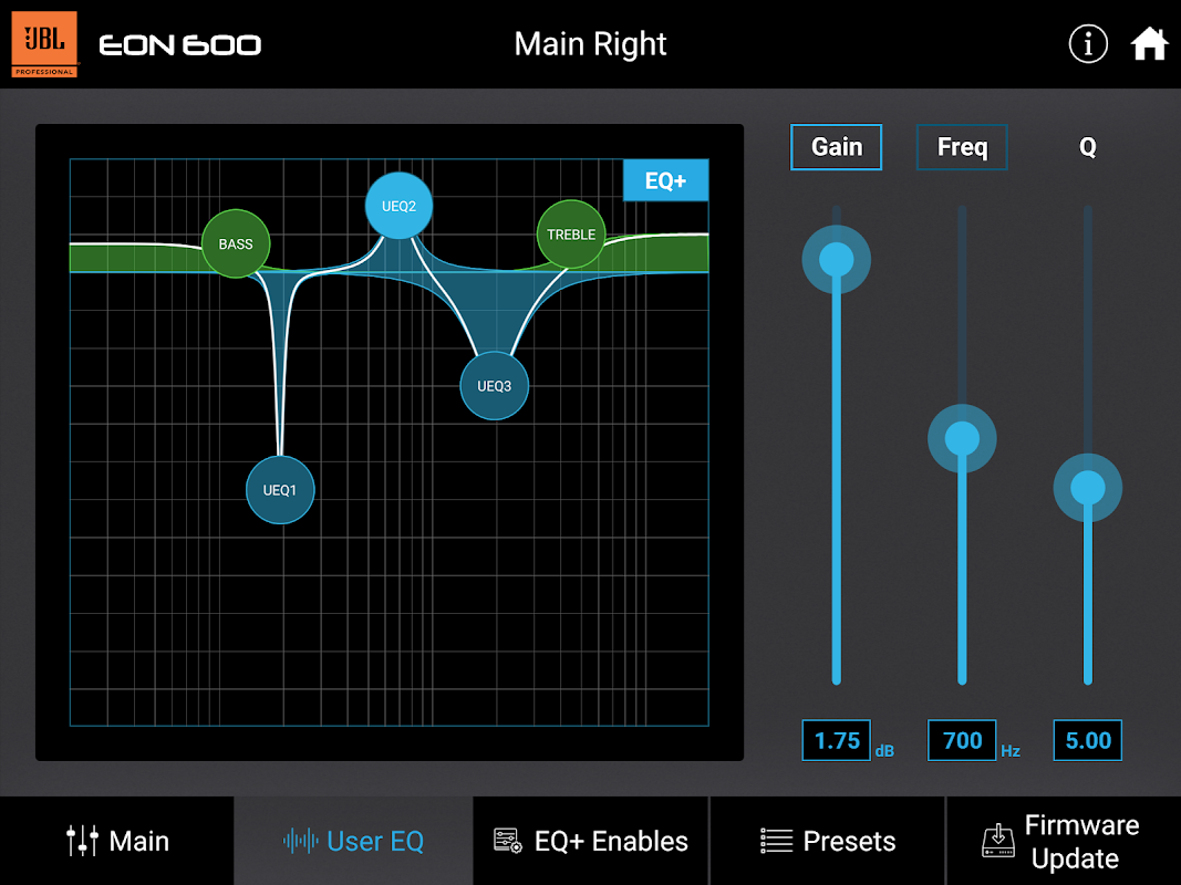 EON Connect is een slimme apparaatapplicatie voor het bedienen van maximaal vier JBL EON 600-serie luidsprekers, met behulp van de ingebouwde Bluetooth-functionaliteit van de EON 600. Met de EON Connect-app kunt u de prestaties van elke luidspreker optimaliseren door exclusieve toegang tot extra DSP-parameters, waaronder drie volledig instelbare parametrische equalizers, plus Hi en Lo Shelf-filters. Bovendien kunt u de luidsprekervertraging instellen voor het compenseren van luidsprekerposities en het mixen van de uitgang regelen. Bovendien past u snel luidsprekerinstellingen toe op andere luidsprekers van de EON 600-serie door het maken en vooraf oproepen van voorinstellingen. U kunt de firmware van elke luidspreker ook rechtstreeks vanuit de EON Connect-applicatie bijwerken naar de nieuwste versie.
