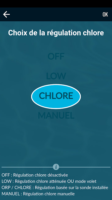 - Accès aux commandes principales de l’appareil (Température, Sel, pH, gestion du Chlore, temps de filtration)