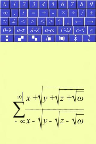 Vergelijkingen creëren en deze brief kunst in beweging. Gebruik uw mobiele telefoon om vergelijkingen te maken. Eenvoudig en intuïtief 2D navigatiesysteem. Handig voor het maken van notities in lezingen of om vergelijkingen die je kunt herinneren op een later tijdstip op te slaan. U kunt elke vorm van vergelijkingen, zoals veeltermen, tensor vergelijkingen matrices of wat je maar kunt bedenken, omdat je totale vrijheid over hoe je de symbolen te regelen. U kunt ook de ASCII art behulp van een verscheidenheid van symbolen.