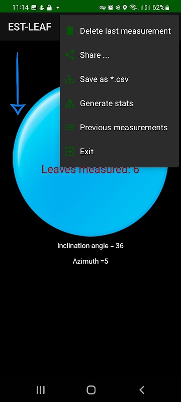 De hellingshoeken van het blad worden gemeten met behulp van de plaatsing van de telefoon. Relevante verdelingsparameters van de bladhellingshoek (gemiddelde, standaarddeviatie, bèta, Campbell, G-functie, deWit-type) worden geschat. Metingen, resultaten kunnen worden opgeslagen en geëxporteerd.
