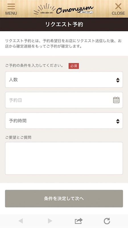 希望の人数・日時を指定して送信するだけで予約を依頼できます。