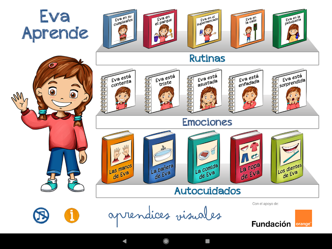 Eva Learns, een verzameling verhalen aangepast aan pictogrammen om te leren terwijl je plezier hebt, ontworpen voor Visual Learners door een team van medewerkers, illustratoren, psychologen en gespecialiseerde professionals, met de steun van de Orange Foundation.