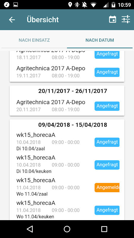 So geht heute Einsatzplanung mit deinem Arbeitgeber! Mit Event Commander bist du jederzeit über deine Einsätze bei deinem Arbeitgeber informiert und die Planung über die App wird kinderleicht. Alle wichtigen Infos und Unterlagen zu deinem Einsatz auf einen Blick. Bestätigte Einsätze können mit dem Kalender auf dem Smartphone synchronisiert werden und mit der automatischen Verlinkung zu google maps wirst du zielsicher an den Einsatzort geführt.