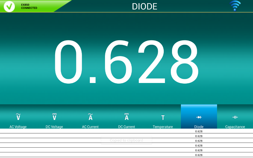 This ExView app allows your EX850 clamp meter to function in a manner similar to clamp meter and digital multimeter (DMM) models currently available with a detachable wireless, remote display. The advantage of the app however is that the display on the clamp meter remains intact and continues to function, displaying readings locally in addition to the remote display on the Android mobile device. Additionally, no PC or wireless transmitter/receiver dongle or other accessory is required to view readings remotely.