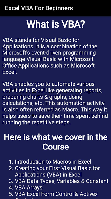 VBA Excel is a new tutorials app for the beginners and it will a lot to the beginners