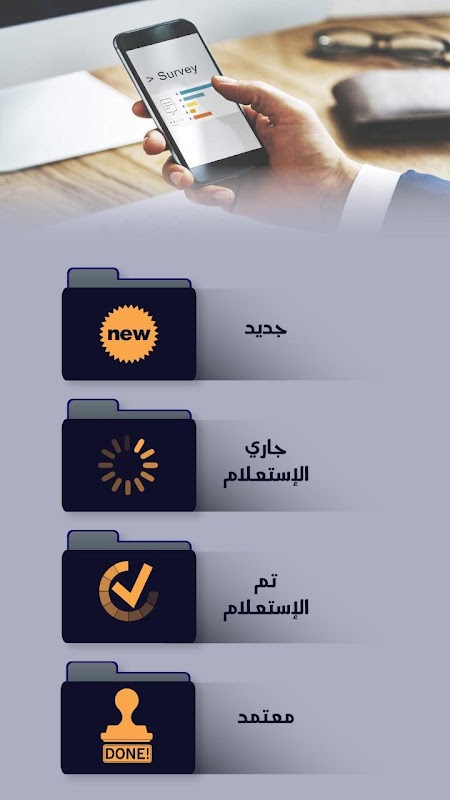 تطبيق مختص ب ال survey حيث يستطيع المستعلم تسجيل الاجابات الخاصة ب الاسئلة للعميل وارسالها للسيستم واخذ موقع وصور