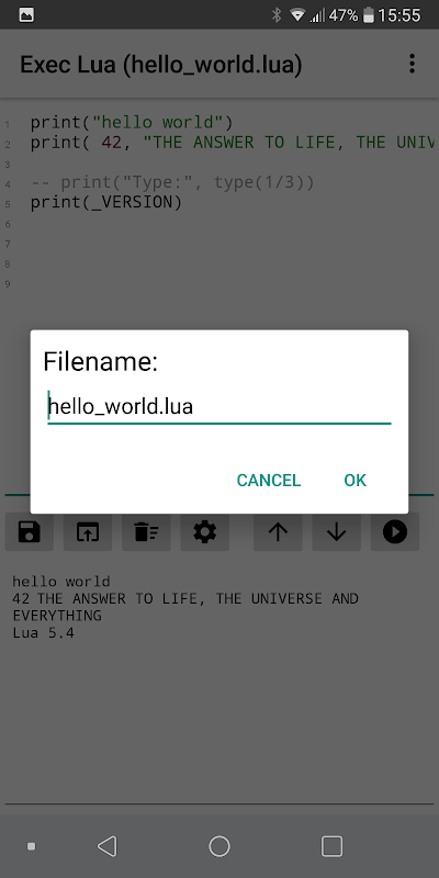 Deze app is een ontwikkelomgeving voor de scripttaal Lua voor Android. U kunt Lua-scripts ontwikkelen, uitvoeren en beheren.