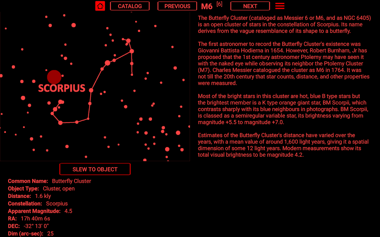 Voor sterrenobjecten gebruiken we de Hipparcos / Tycho II-database. Waar mogelijk hebben we verwezen naar de Bayer-, Flamstead-, SAO-, HD / Harvard-, DM-, BD / CD / CPD- en GSC-catalogi. De gebruiker kan met elk van deze aanduidingen zoeken om een bepaalde ster te vinden. Wanneer het systeem voor het eerst start, laadt het de 2.000+ sterren van magnitude 5.5 en helderder. De gebruiker kan de extra 72.000+ sterrencatalogus indien nodig laden.