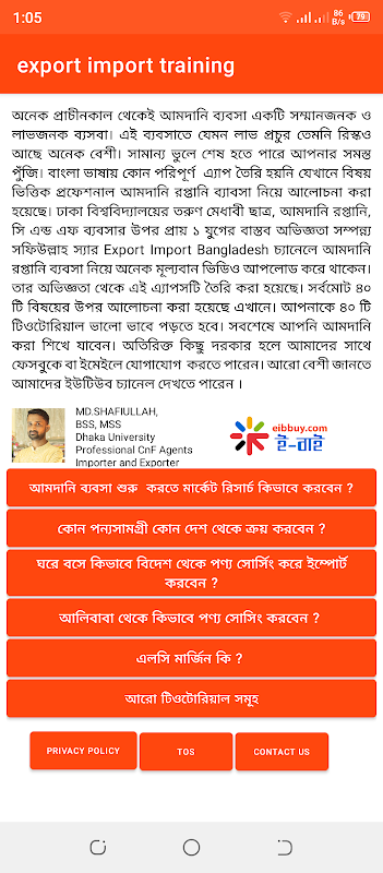আপনাকে আমদানি ব্যবসা নিয়ে বাস্তব প্রশিক্ষণ নিতে হবে। ভাষায় কোন পরিপূর্ণ এ্যাপ তৈরি হয়নি যেখানে বিষয় ভিত্তিক প্রফেশনাল আমদানি রপ্তানি ব্যাবসা নিয়ে আলোচনা করা হয়েছে। ঢাকা বিশ্ববিদ্যালয়ের তরুণ মেধাবী ছাত্র, আমদানি রপ্তানি, সি এন্ড এফ ব্যবসার উপর প্রায় ১ যুগের বাস্তব অভিজ্ঞতা সম্পন্ন্য সফিউল্লাহ স্যার Export Import Bangladesh চ্যানেলে আমদানি রপ্তানি ব্যবসা নিয়ে অনেক মূল্যবান ভিডিও আপলোড করে থাকেন। অভিজ্ঞতার উপর ভিত্তি করেই এই অ্যাপটি তৈরি করা হয়।