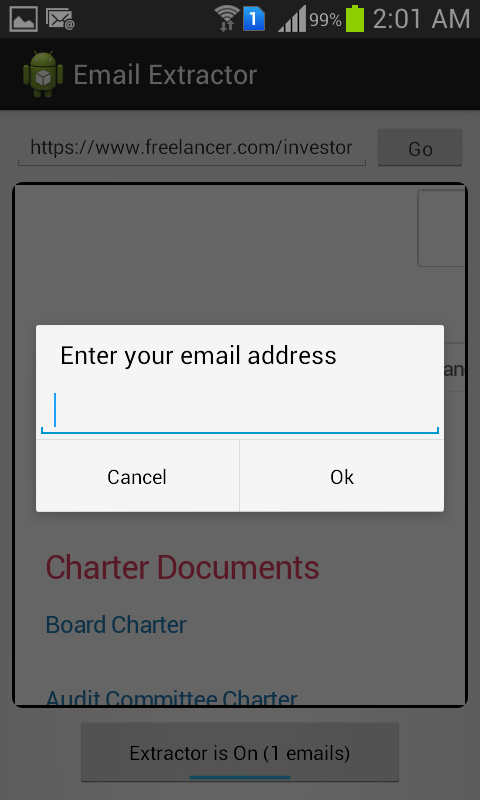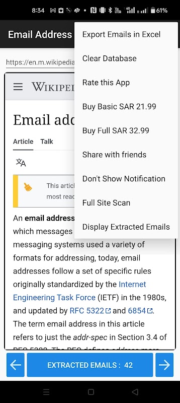Extracteer eenvoudig e-mailadressen van elke webpagina met deze krachtige e-mailextractietool. Navigeer door websites en laat de app automatisch e-mailadressen voor u vastleggen en opslaan.