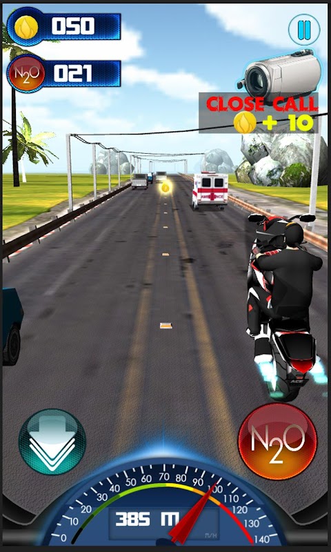 As you collect coins, you get a little nitro refill for your nitro cylinder installed in your super bike. The nitro can also be refilled by over taking the cars really close. Close calls will also awards points.