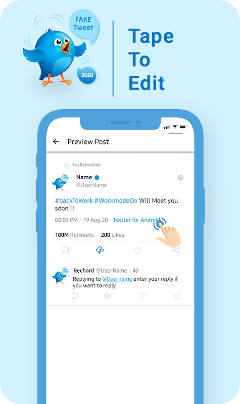 Deze prachtige "nep tweat-posteditor - nep-tweatmaker voor twita" stelt je in staat om reacties en vind-ik-leuks te vergroten. U kunt uw nep-tweets-screenshot bewerken/maken en delen met uw vrienden. Prank je vrienden, leef je Twitter-droom uit en maak grappige memes door van de Twitea van vandaag je eerste nep-Tweat te maken!