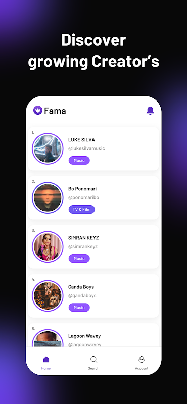 De mobiele app van Fama is de makkelijkste manier om Creators te vinden die het waard zijn om in te investeren.