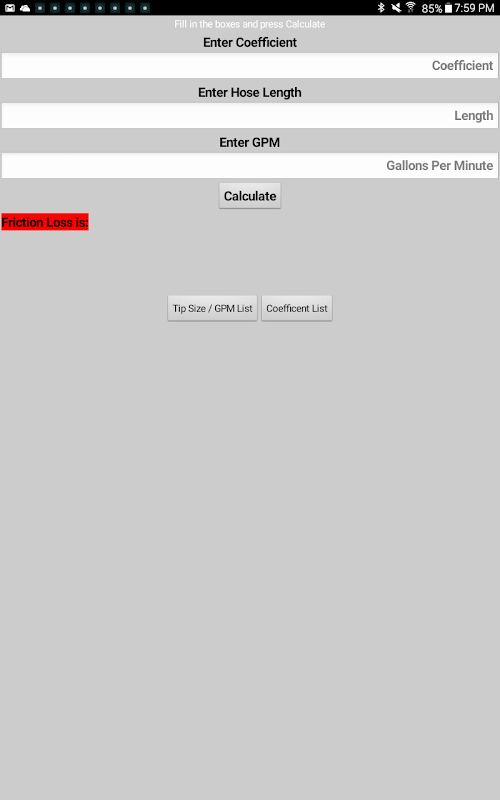 Wrijvingsverliescalculator, benodigde brandstroom, tanker-shuttle / plattelandswater- en pompafvoerdrukcalculatoren. De gebruiker kan elke numerieke waarde in elk van de tekstvakken invoeren om de hoeveelheid wrijvingsverlies in een bepaalde slanglengte te vinden. Met de app kunnen alle getallen worden gebruikt voor nieuwere slangen en coëfficiënten. Ik heb twee referentiepagina's bij de app geleverd voor gangbare slangcoëfficiënten, samen met de gebruikelijke tipgroottes en gallons per minuut voor elke tipgrootte.